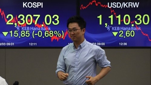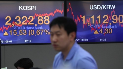 Indeks Kospi di Bursa Efek Korea, Seoul, Korea Selatan,...